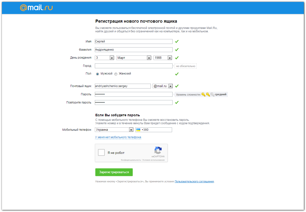 Регистрация ящика электронной почты.