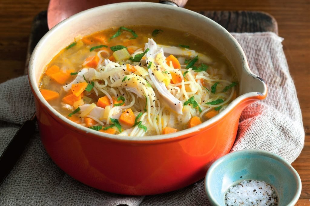 Куриный суп в кастрюле.