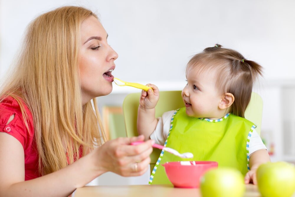 Мама кормит малыша с ложки.