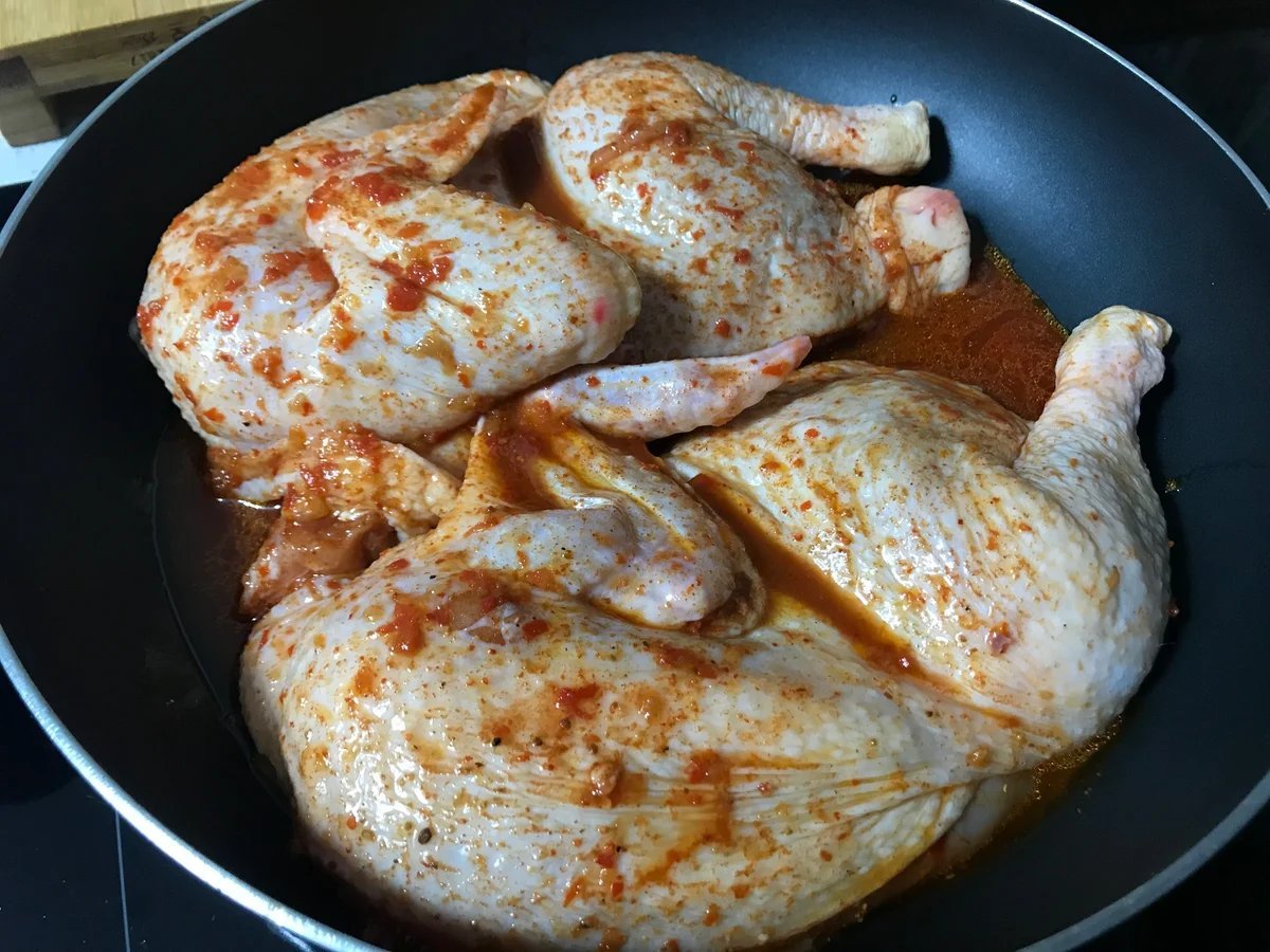 Курица с корочкой на сковороде.