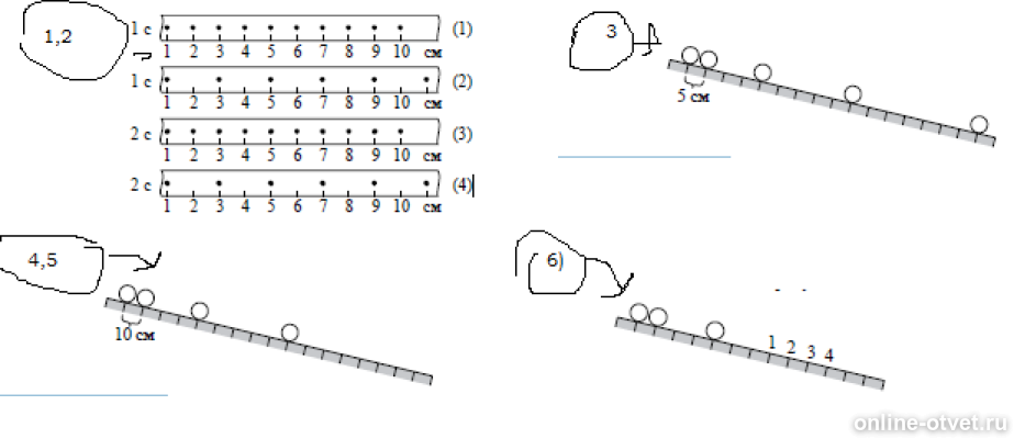 На рисунке точками на линейках показаны положения четырех равномерно.