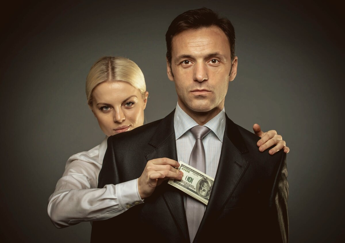 Мужчина и женщина делят деньги.