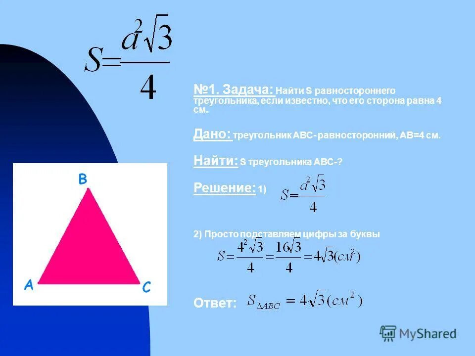 Формула нахождения площади равностороннего треугольника.