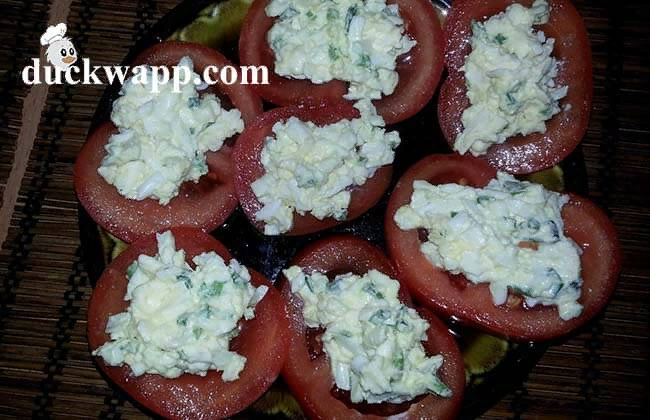 Помидоры с чесноком и майонезом.