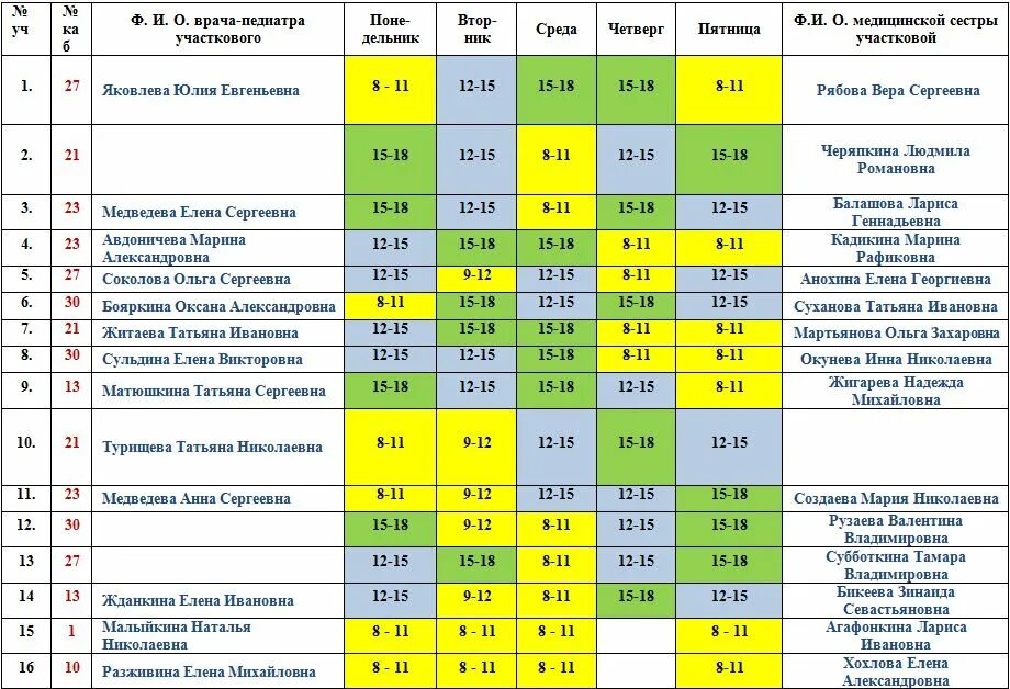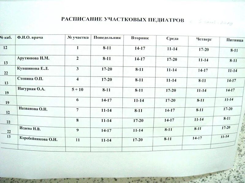 Расписание педиатров в детской поликлинике.