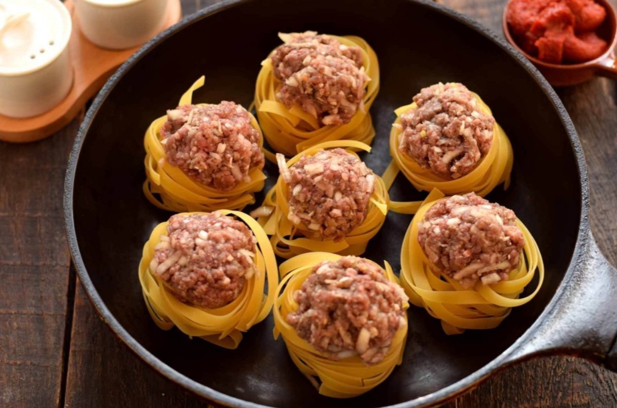 Паста гнезда с фаршем.