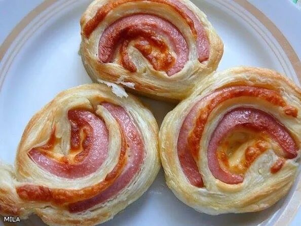 Розочки из слоеного теста с колбасой.