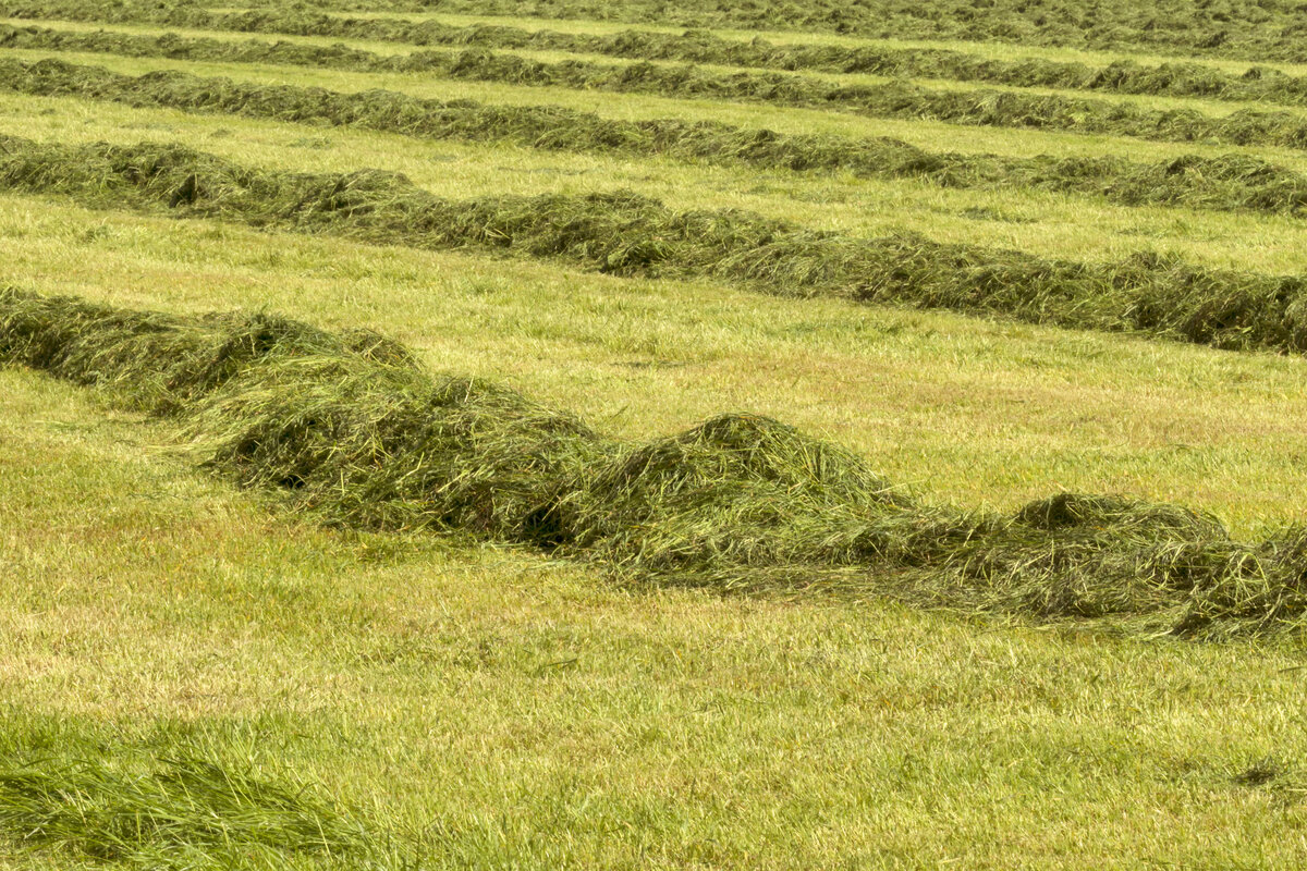 Сенокос свежескошенная трава.