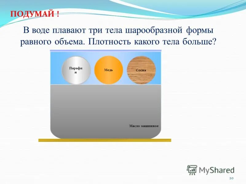 На какое из тел действует большая Архимедова сила.