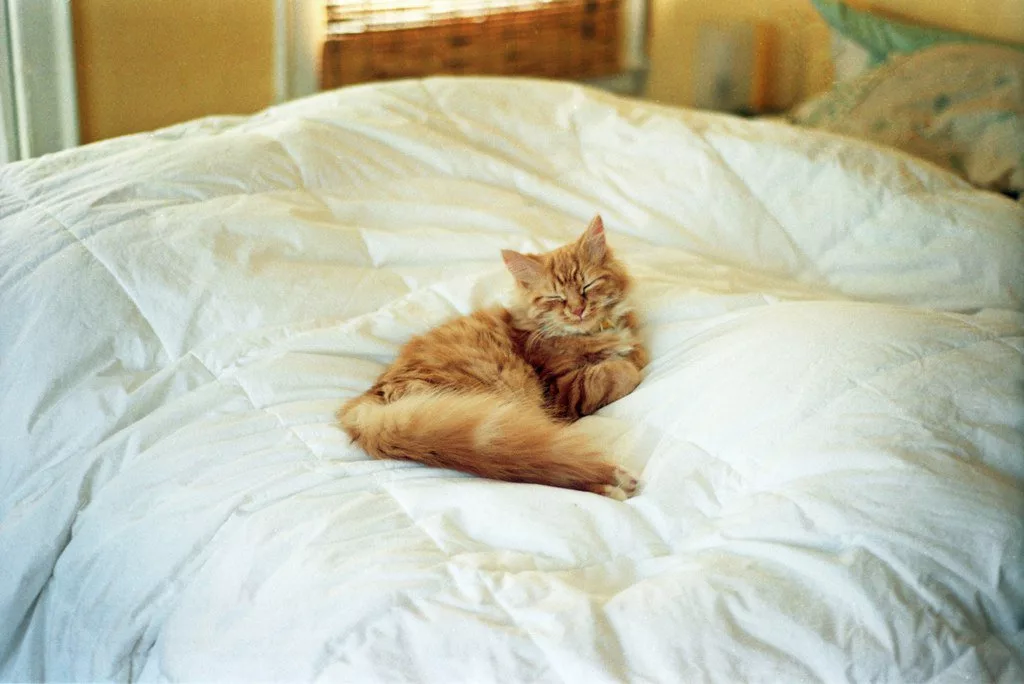 Спит в кровати.