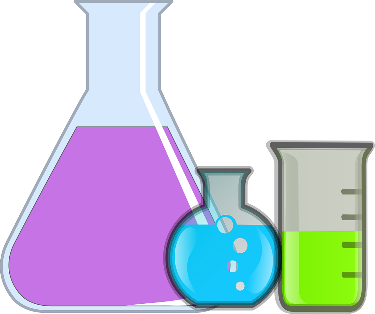 Химические колбы с розовой жидкостью.