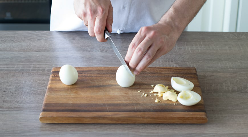Нарезка яиц в заливном.